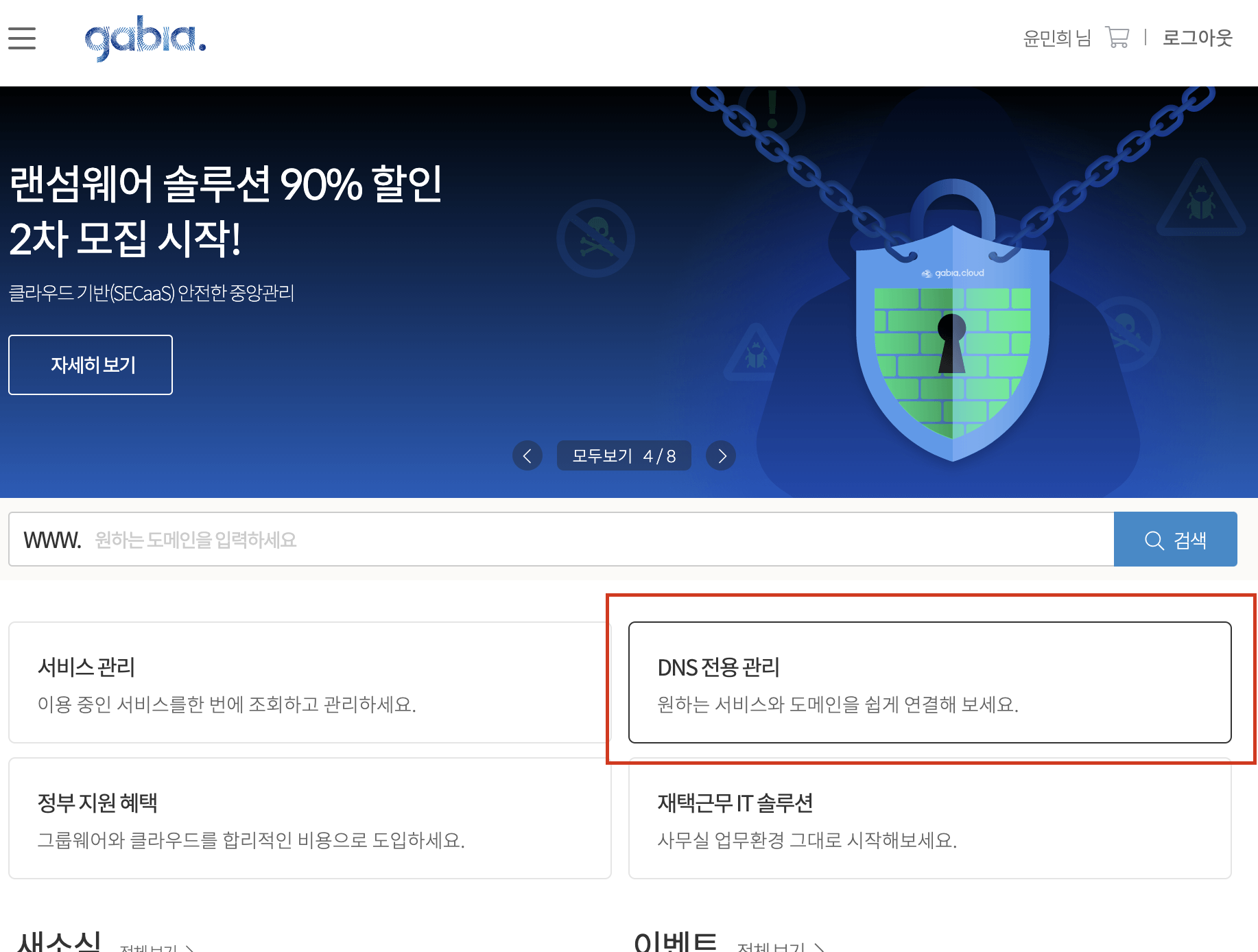 1. gabia 회원가입 - 로그인 - DNS 전용 관리를 클릭한다.