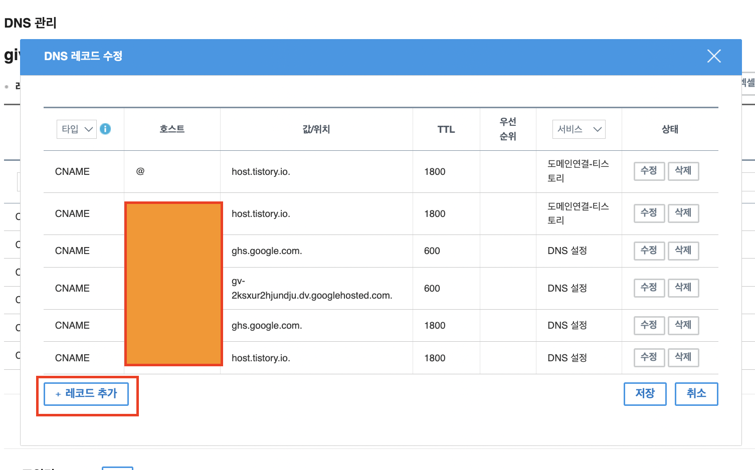 6. 타입은 CNAME, 호스트 이름은 자신이 원하는 단어, IP 주소는 티스토리라면 host.tistory.io. TTL 1800 으로 설정한다. (구글 블로그라면 IP 주소를 ghs.google.com.) - 입력이 끝나면 저장을 누른다.