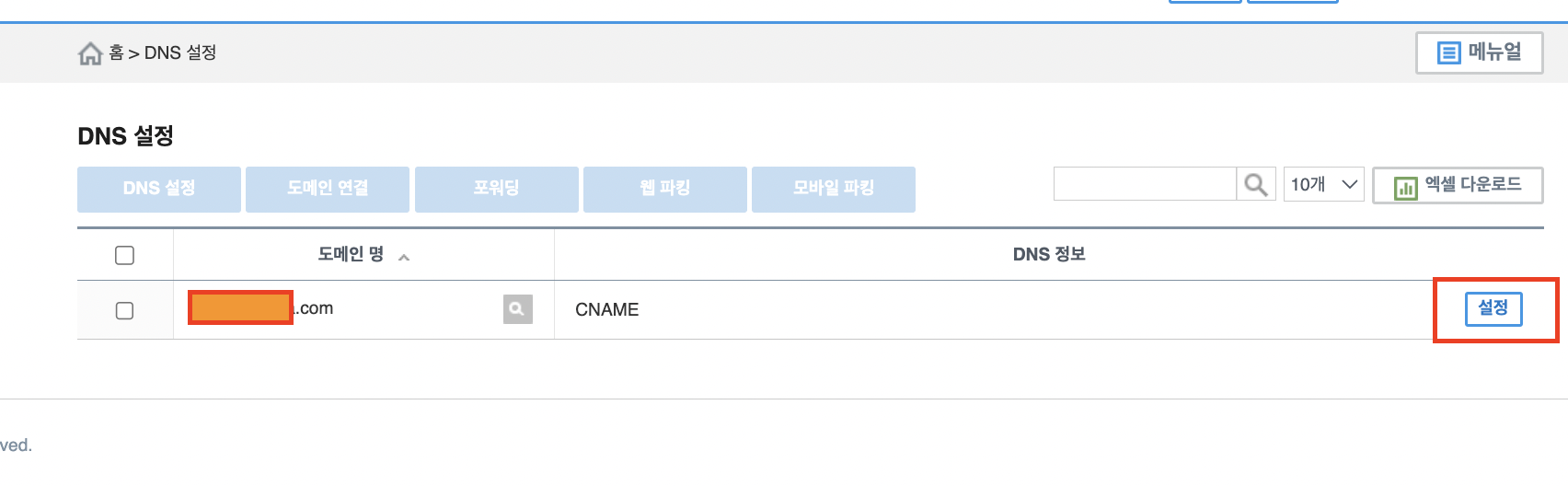 3. 구매한 도메인이 표시되어 있을 것이다.  우측 설정 버튼을 클릭한다.