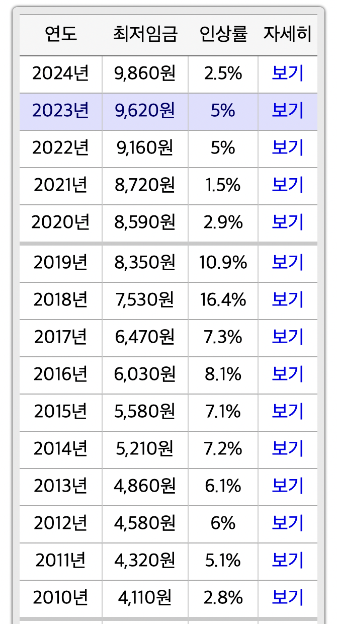 글을 마무리 하기 전에 연도별 최저 시급을 정보로 남겨둘게요!